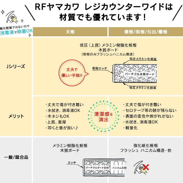 ●天板・幕板・棚板・引出内部:低圧メラミン樹脂化粧木質ボード、PVCエッジ ●側板:低圧メラミン樹脂化粧ボード、ペーパーコア、PVCエッジ ●アジャスター:PP |