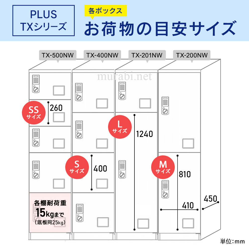 メーカー:PLUS社 ●ムラカミビジネスオリジナル型番商品/TX-1100NW ●外寸/W1350×D515×H1800mm(W450×D515×H1800mm×3連) ●内寸/W414×D469×H400タイプ×10個(H820タイプ×1個) ●質量/32+35+35kg、棚耐荷重/15kg、底棚耐荷重/25kg ●カラー/ホワイト ●材質/本体:鋼板、アミノアルキッド樹脂焼付塗装 ●使用電池:単3形アルカリ乾電池2本(1扉当たり) 宅配ボックス横連結用孔(ハーフパンチ穴)は、下より200/800/1350mm、左右各6ヶ所 SK-CBX-T04 SK-CBX-T05同等 6.5φ |